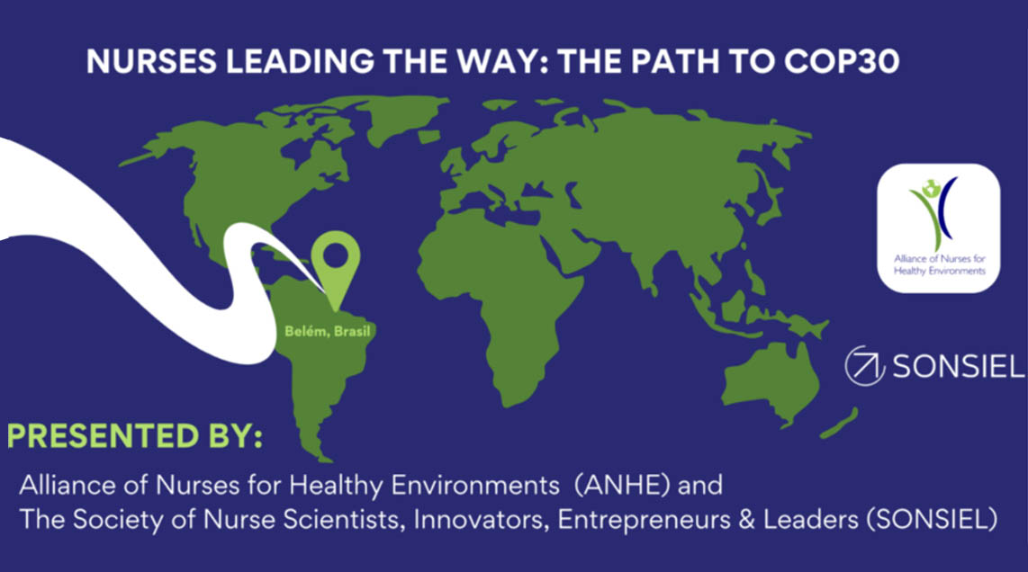 Join the Alliance of Nurses for Healthy Environments (ANHE) and the Society of Nurse Scientists, Innovators, Entrepreneurs & Leaders (SONSIEL) for a series of exciting virtual events leading up to the United Nations Climate Change Conference (COP30) in November 2025! These engaging and interactive sessions, held from April to October 2025, provide an overview of the COP process, how nurses have historically engaged, the broader health community’s urgent call for climate action to safeguard human health, and the context for this year’s COP in Belém, Brazil. The events will showcase inspiring sustainability and innovation initiatives led by nurses on the ground, around the world, and participation at COP. Join us as we explore how health professionals are driving change and why climate action is more crucial than ever!